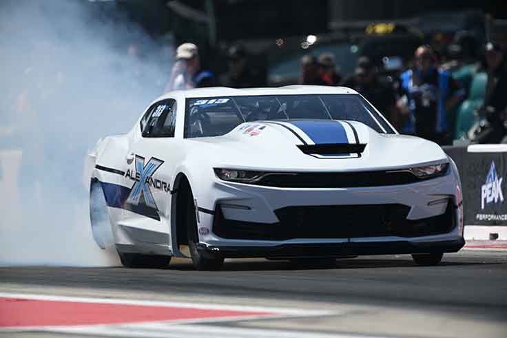 The qualifying order did not change after Saturday’s third and final qualifying run in the Holley EFI Factory X class as Greg Stanfield remains No. 1 with Friday’s 7.101 run in his Rod Shop Camaro. Stanfield is followed closely by his son, Aaron, who posted a 7.119 in his Reher-Morrison themed Camaro. Aaron Stanfield also made the best run during Saturday’s third session with a 7.198 to help set the tone for final eliminations. Jesse Alexandra (pictured) posted a 7.354 in his supercharged Camaro.