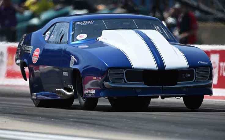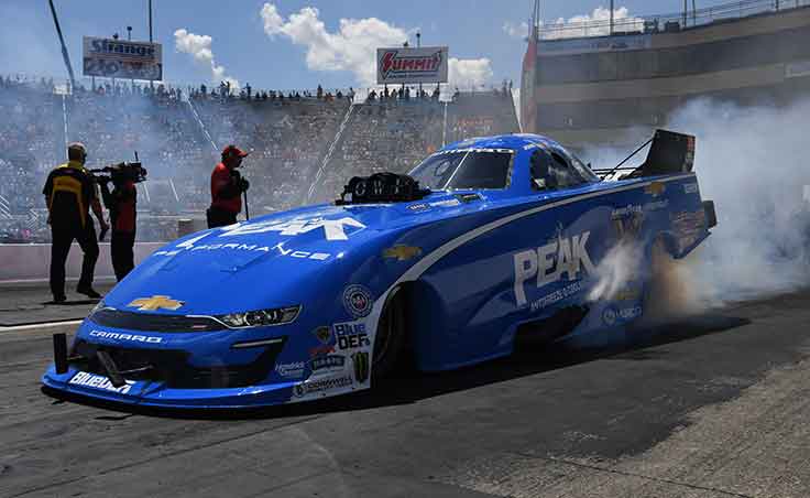 On a day when Funny Car crew chiefs earn their paychecks, Austin Prock captured his fourth low qualifier award of the still-young season with a 5.907 run to hang on to the top spot. Prock, who’s Cornwell Tools Camaro is tuned by his father, Jimmy, also made the quickest run on Saturday after noon with a 3.907 to provided a solid baseline for what’s expected to be another warm day on Sunday.