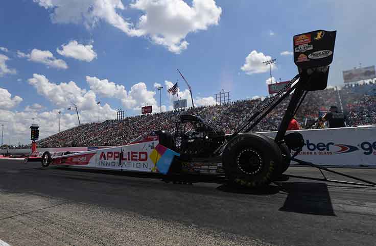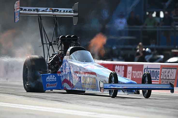 For the first time in his career, T.J. Zizzo will lead a Top Fuel field into Sunday’s final eliminations. Zizzo’s 3.735 run from Friday night held up during both of Saturday’s runs and he’ll be rewarded with a round one race against three-time NASCAR champ Tony Stewart who landed on the bump with a 3.852.