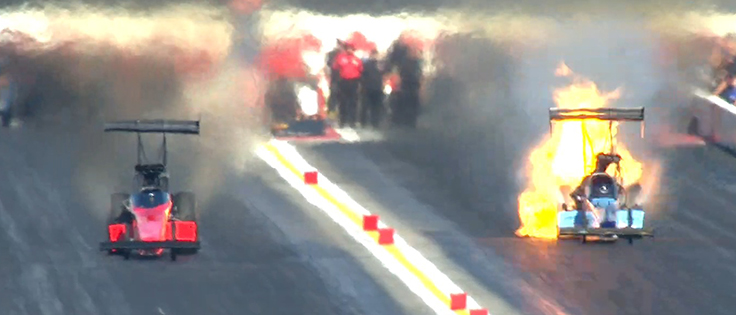 Ron August Jr., making his first start since a jaw-dropping semifinal finish in Sonoma, had an explosive moment on his first pass alongside Jasmine Salinas. who ran 3.73 but punctuated her run with a blower backfire in the lights. August has the bump spot at the aforementioned 4.12.