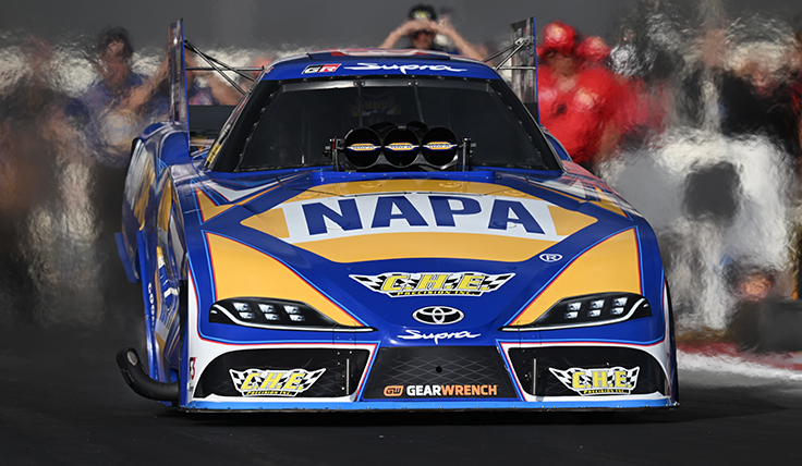Ron Capps uncorked a track-record and career-best 3.821 in the NAPA Toyota, bettering the 3.873 he ran in Reading way back in 2019. The old track record was even older, 3.822 by Matt Hagan at the 2017 Winternationals. Austin Prock was right behind him with a 3.822, which keeps him No. 2 but he passes Friday leader jack Beckman's 3.828.