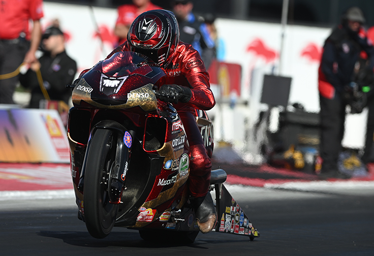 Matt Smith’s slim title hopes remained alive when he rana 6.721 in the opening round of Pro Stock Motorcycle qualifying. Smith not only took the provisional No. 1 spot, but picked up four much-needed qualifying bonus points. Smith came into the event trailing Gaige Herrera by 123 points and needs to get that margin to 119 or less, he’ll remain in the running for the title into tomorrow’s final eliminations.