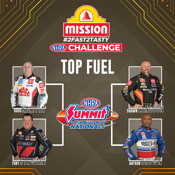 The opposite side of the #2Fast2Tasty ladder features two-time 2024 race winner Shawn Langdon and his Kalitta Air Careers rail. Most recently, Langdon was runner-up in the Bristol Mission Challenge. He will race fellow Virginia semifinalist Antron Brown in the first round of the bonus event that pits the previous event's semifinalists against one another for bragging rights and bonus points that will come into play when the Countdown to the Championship begins. Brown, driver of the Matco Tools dragster, won the #2Fast2Tasty Challenge in Las Vegas and was runner-up in Charlotte.