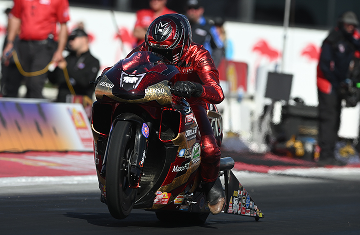 Steve Johnson left well ahead of Jianna Evaristo and made that stand up for a 6.803 victory. Johnson is wrapping up his 37th season as a Pro Stock Motorcycle racer. Johnson will race Richard Gadson, who advanced after a foul start by Ryan Oehler.