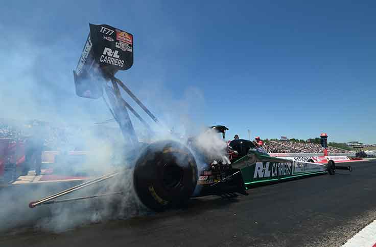 Tony Schumacher admittedly didn’t run well in qualifying and his 4.170 in round one wasn’t exactly a work of art, but it was enough to turn on the win light after Brittany Force smoked the tires at half track. Schumacher, the No. 14 qualifier, picked up his fourth round win of the season, three of which came in his runner-up finish in Pomona.