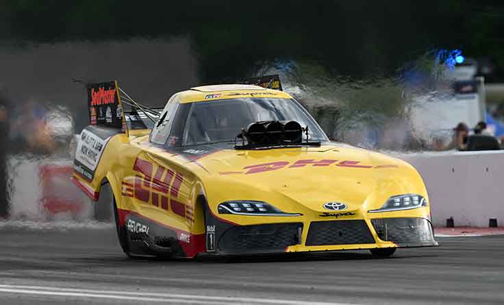 One day after honoring the memory two-time world champion Scott Kalitta with their annual lobster dinner, all three Kalitta Motorsports entries are in the semifinals after J.R. Tood took care of business against defending event winner Bob Tasca III in round two. Todd ran a 4.079 in the DHL Toyota Supra that was enough to beat Tasca’s slowing 4.325. Todd, winner of the Gainesville season opener, is coming off a round one loss in Chicago. He entered Epping as the No. 4 ranked driver in the class.