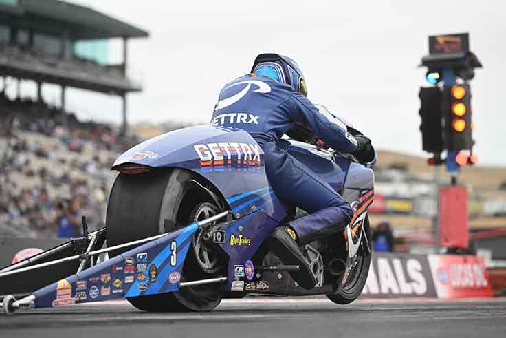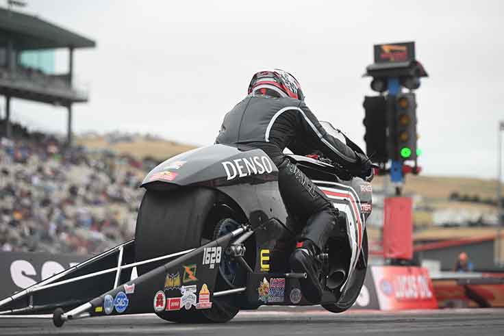 After winning yesterday’s GETTRX Pro Stock Motorcycle Allstar NHRA Callout, Matt Smith Racing will also win the Denso Sonoma Nationals. Smith got a bye run into the final round by virtue of his low qualifying effort on Saturday and he’ll have lane choice against teammate John Hall thanks to a 6.706 on his Denso Buell.