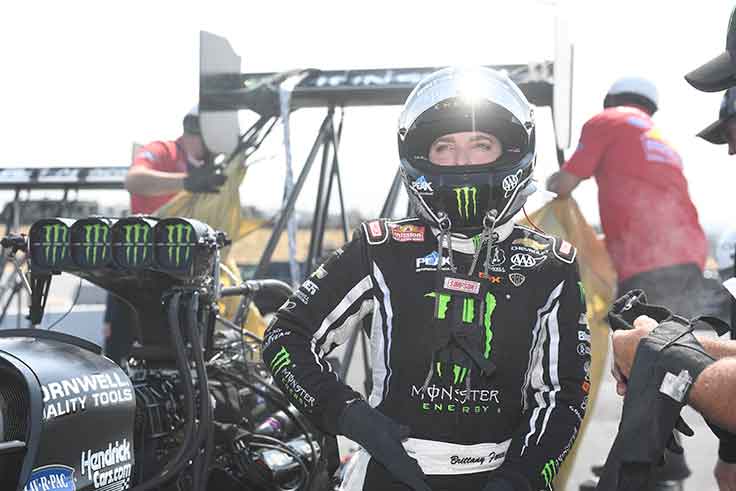 Stewart wasn’t the only driver who got a much needed semifinal as Brittany Force racked up a few more points in her Monster Energy dragster with a 3.746 to power past Billy Torrence, who hazed the tires at half-track. Force cannot automatically make the Countdown to the Championship after she missed the Norwalk round.