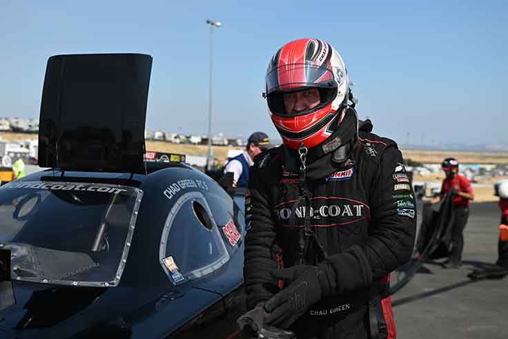 Ron August Jr. pulled off what is so far the biggest upset of the season when he took out world champ and low qualifier Doug Kalitta in round one. Kalitta smoked the tires at half track but appeared to get a reprieve when August’s car appeared to pop the burst panel. August’s momentum carried him across the finish line first, 3.985 to 4.030. Incredibly, August will now have a bye run into the semifinals thanks to the short 14-car field in Sonoma. August had one previous round win in Top Fuel, and it came against Steve Torrence.
