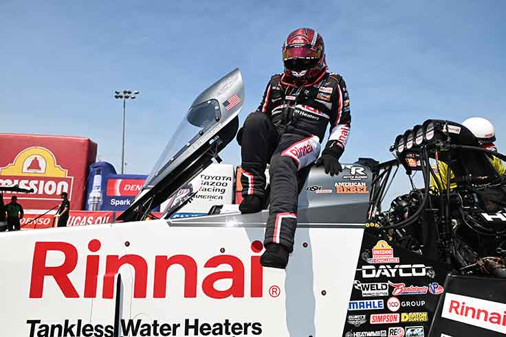 Tony Stewart earned a much-needed win when he took out Mission #2Fast2Tasty winner Shawn Langdon in round one. Langdon’s Kalitta Air dragster was slightly ahead at half-track, but slowed to a 3.845 at just 288-mph. That was more than enough for Stewart’s Rinnai dragster to light the win light with 3.740, their best run of the weekend.