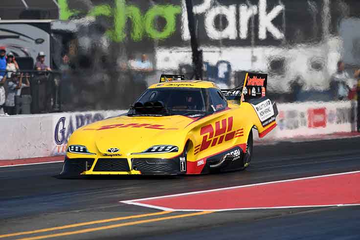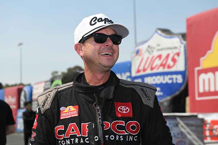 Ron Capps and J.R. Todd both list Sonoma Raceway as one of their favorite tracks on the NHRA tour and it’s possible that Capps likes it a bit more right now as he powered to a 3.907 to 3.943 win against Todd’s DHL Toyota Supra in the quarterfinals. Capps has been to the semifinals just four times this season including his lone final round last month in Norwalk.