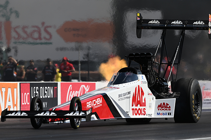 Doug Kalitta’s reward for qualifying No. 1? A first-round matchup with his teammate, red-hot Shawn Langon, and four-time world champ Steve Torrence. That’s the bad news. The good news is that their first-round quad has only three cars as only 15 cars made qualifying attempts. Sixteen cars were entered but Rob Passey’s car was DQ’d in tech.