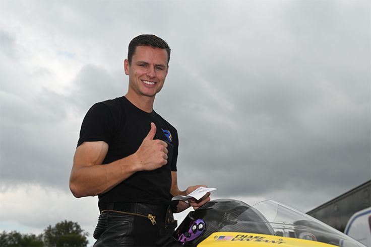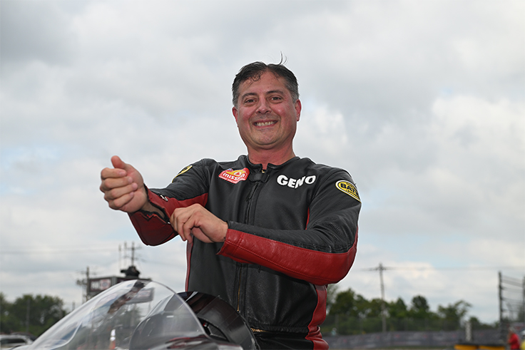 Riding for Vance & Hines, former champ Geno Scali does exactly what he needs to do for the team with a .014-second reaction time that knocks Matt Smith out on a holeshot. Smith was .098 on the tree and went 6.986 to Scali’s winning 6.998.