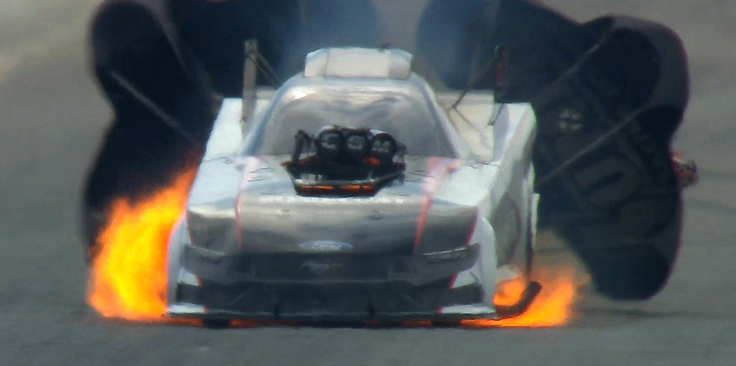 After No. 1 qualifier Austin Prock makes the best run of the weekend in his AAA Chevrolet – a 3.814 that is the best of the season and a new World Wide Technology Raceway track record – Chad Green also puts on a show in his Bond-Coat Ford. There doesn't seem to be a ferocious explosion, but there's a big ball of fire beneath the Funny Car body as he pulls the parachutes. Green gets the win over a tire-smoking Dale Creasy Jr., but his team will have a lot of work to do to make the next round. Green emerged from the car of his own accord, but we're on hold for clean-up.
