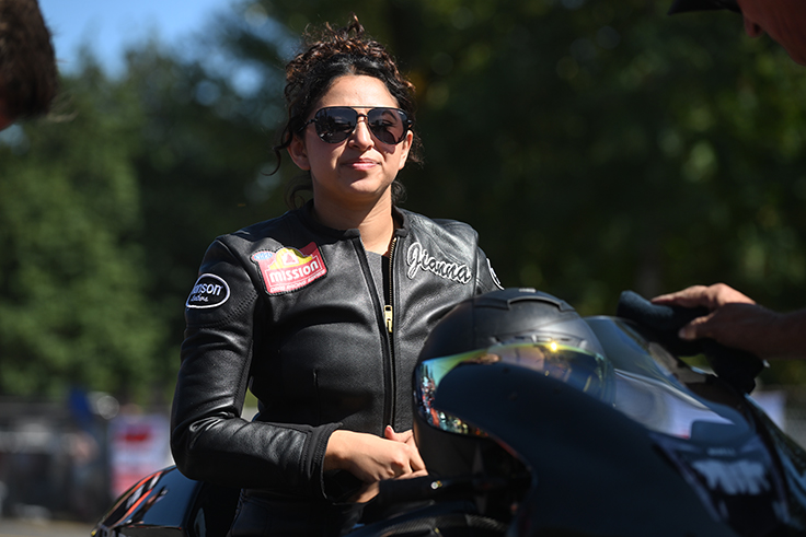 Jianna Evaristo steals the track speed record from Matt Smith Racing teammate Angie Smith with a run of 201.52 mph on a 6.73 pass to upset Steve Johnson, and, one pair later, Angie's day gets worse as her Denso Buell appears to bog against teammate John Hall, who advances with a 6.86.