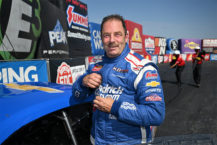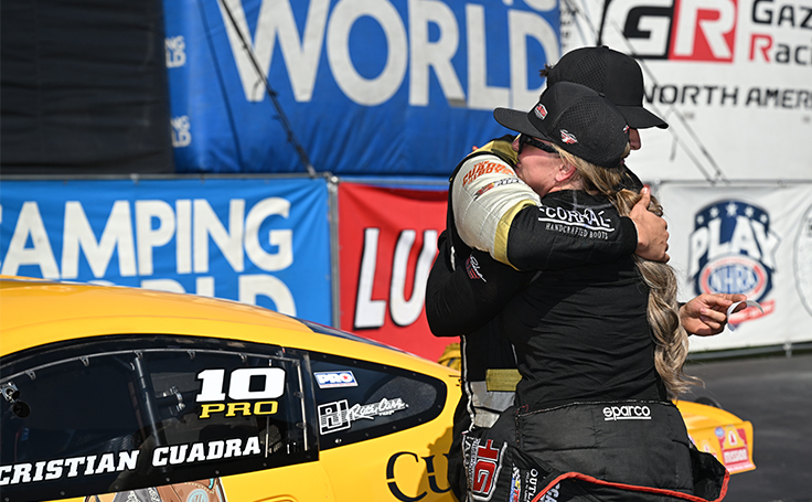 Matt Hartford dug deep into years of diverse drag racing experience to save his The Hose Connection Chevrolet as both he and Camrie Caruso get loose as soon as they leave the starting line. Hartford’s car pulled dramatically to the centerline just past the tree, but he reeled it back in when he saw Caruso wasn’t with him. Hartford gets the win, and crew chief Eddie Guarnaccia says that although they were way too aggressive, they felt pretty confident going into this round. At the top end, Hartford’s adrenaline is on full display.
