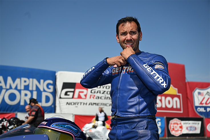 Something is up over on Jianna Evaristo’s side of the track as she is way tardy with a reaction time that shows up as .266. This gives Gaige Herrera a ginormous and immediate advantage, and he powers ahead for a decisive 6.835 to 7.010 win. Herrera will race in the final for the 10th time this season and is in the hunt for the 20th Pro Stock Motorcycle win of his career.