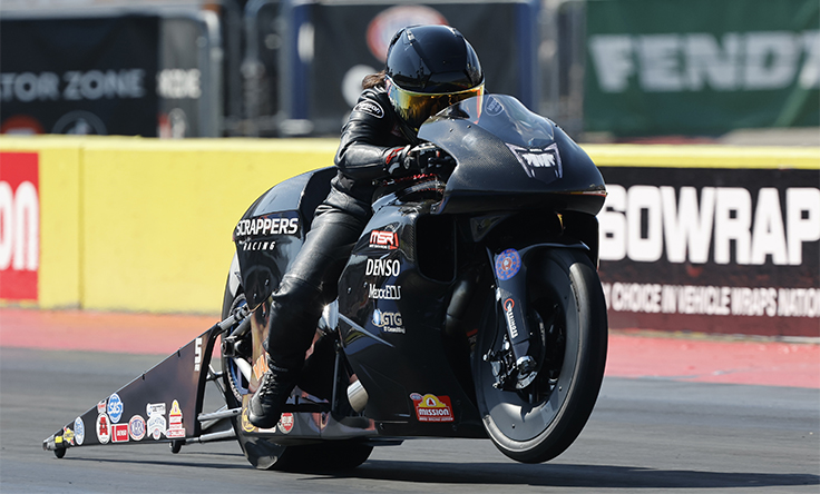The Matt Smith Racing Denso-backed Buells are efficient in terms of speed and productivity: Angie Smith flies to a 202.54 mph run that defeats a troubled Chris Bostick, while Matt recovers from a .107 reaction time with a6.776, 202.48 to beat Malcom Phillips Jr. Their MSR teammate John Hall goes red, as does Vance & Hines rider Geno Scali, which sends Steve Johnson ahead on a strong 6.774 that is low of the round until Gaige Herrera drops a 6.758 on his solo run.