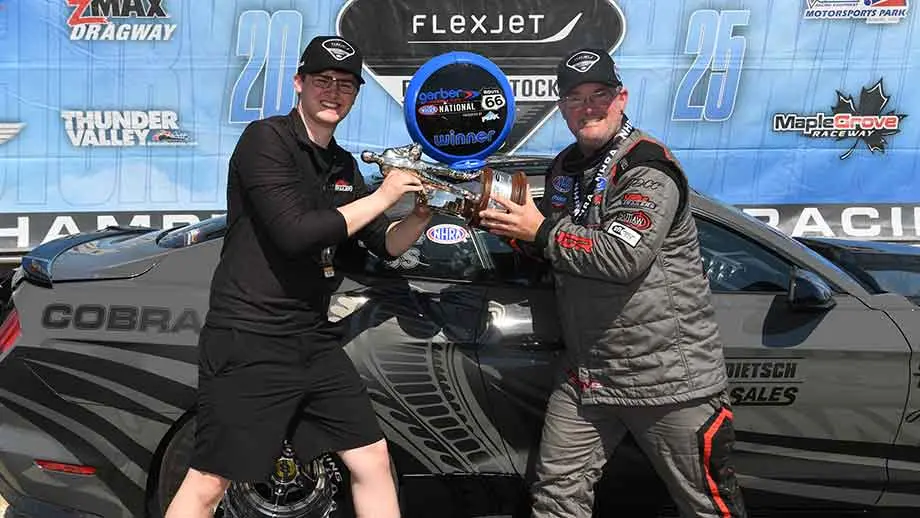 Jason Dietsch began racing in the Flexjet Factory Stock Showdown Series in 2018 and over the years the owner of Jason Dietsch Trailer Sales built his racing program at a steady pace. Three weeks ago, at the Gerber Collision and Glass Route 66 NHRA Nationals in Joliet, Dietsch accomplished a rare double win capturing the title from the postponed Amalie Motor Oil NHRA Gatornationals on Saturday and the Route 66 event win on Sunday. Claiming his second win in 24 hours, Dietsch had to outrun his son, Taylor, in the semifinal round.