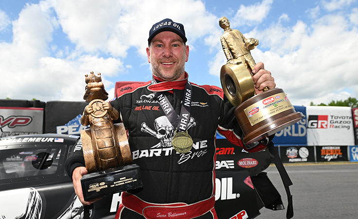With a win in the delayed final round from the Amalie Motor Oil NHRA Gatornationals and an encore performance in Sunday’s four-wide final round, Sean Bellemeur racked up a few more milestones in what is rapidly becoming a Hall of Fame career. First, Bellemeur’s victory over Chip Beverett in the Gainesville final marked the first national event victory for an injected nitro Funny Car in the Top Alcohol Funny Car class. On Sunday, Bellemeur returned to win his 45th national event, breaking a tie with Bob Newberry for this place on the all-time wins list. Bellemeur has a long way to go to catch leader Frank Manzo (106 wins) or even second-place Pat Austin at 70, but Bellemeur’s record is even more impressive when one considers that he won his first race in 2015, just a decade ago. It’s also worth noting that team owner Tony Bartone has 38 Top Alcohol Funny Car titles, giving them 83 as a duo.