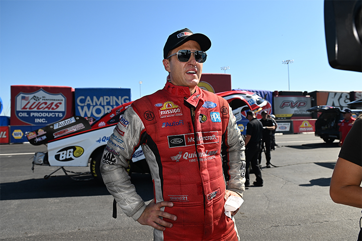 After finishing in the top five in each of the previous six seasons, Bob Tasca III has not had the season he expects. Entering this past weekend's event, he was No. 12 in the Funny Car standings with nary a final round on his scorecard. The driver of the Motorcraft Quick Lane Ford appeared to be turning a corner the prior race in Charlotte — he qualified sixth; his best since he was No. 2 at the NHRA New England Nationals — and in St. Louis, he started from an even-better fourth position paired with a brilliant Todd Okuhara/Aaron Brooks-tuned 337.33-mph pass that held as top speed of the meet. A first-round victory that chopped heavily into Ron Capps' title hopes sent him ahead to a quarterfinals meeting with Chad Green, where a 3.966 stood as second-quickest of the round. If not for a bit of a delay leaving the starting line, that strong pass from Tasca would have cut a clear path to the No. 8 points position. He's 209 points out of the lead and 11th for now, and a championship isn't really in the cards for Tasca this year – but the team has had their heads down and are stepping up to prove they can and will challenge for trophies along the way to Pomona.