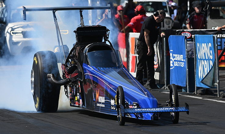 Bob Tasca III, winless for more than a year (Sonoma 2024), leads after the first session with a 3.932, one of just four three-second passes in the heat of the day. Tasca loves the Motoreplx; two years ago, he made his career-best pass, a 3.822.