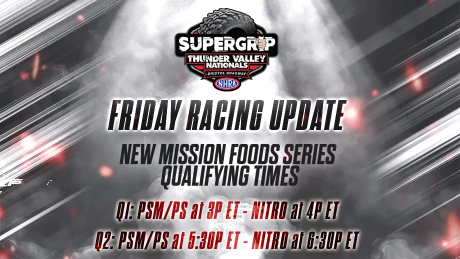 Due to possible pending weather, NHRA officials announced a schedule change for Friday’s two NHRA Mission Foods Drag Racing Series qualifying sessions for the Super Grip NHRA Thunder Valley Nationals at Bristol Dragway.