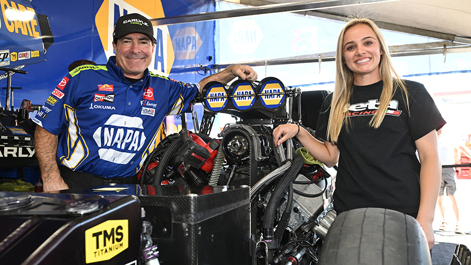 Future Top Fuel pilot Maddi Gordon warms up Ron Capps' Funny Car