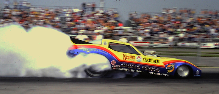 Joyce: “I really like this shot of John Force and the Wendy’s Corvette from Indy, in 1979, I think. Back in the day, he was one of the original leakers; who knew he’d become so good? I really like that one because of the blur and the crowd and the nice burnout that he's doing; he was probably still working for hamburgers back then.”