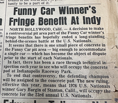 There was but one small island of concrete on that side, near an exit gate out to a bordering side street. The gate was closed during the race, so it made an ideal pit spot. The racers called it “the slab,” and competition for the spot was so fierce that the first race of the U.S. Nationals was usually the one to reach that spot.