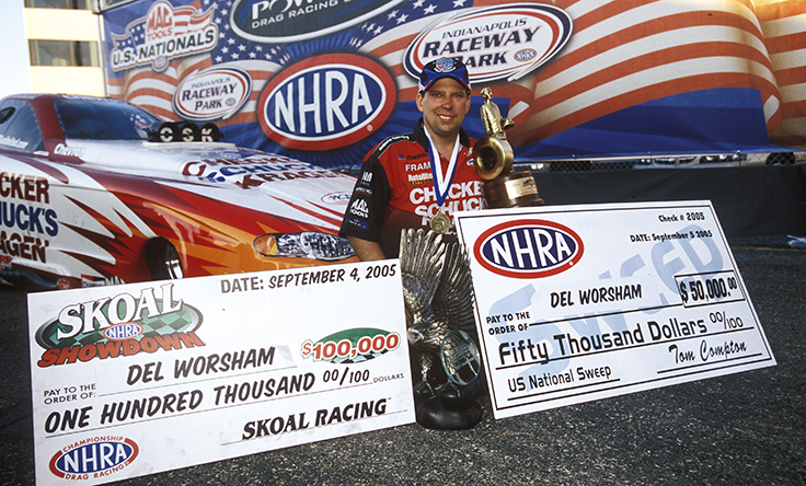 Twenty years ago, Del Worsham and his father, Chuck, stunned the Funny Car class by winning both the Skoal Showdown bonus event and the NHRA U.S. Nationals on the same weekend, a rare “double-up” that earned him $225,000 and a permanent place in Indy history. The victory was made even more special by the family partnership behind it, with Chuck calling the tune-up that carried Del past Frank Pedregon in a razor-tight Monday final. For the Worshams, Indy became the stage where a father and son proved they could take on the sport’s biggest names and win it all.
