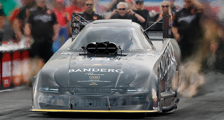 Alexis DeJoria, who had a major thrash between rounds — both the JCM Funny Car and Top Fuel teams were working hard — after a major engine/blower/body explosion in her Bandero Café entry on her 3.92 low e.t. eliminations blast in round one, advanced to the semifinals with a 3.99 against traction-plagued Bob Tasca III.