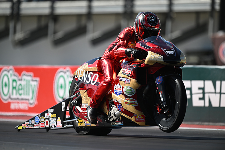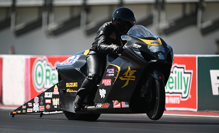 Kelly Clontz’s long climb back into contention paid dividends when she topped Ryan Oehler in the opening round of Pro Stock Motorcycle. Clontz rode to a strong 6.827 on her Steamfitters UA Local 602 Suzuki to advance.
