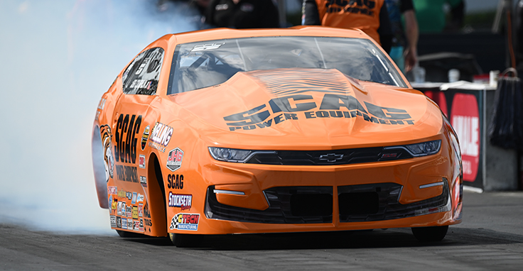 Jeg Coughlin Jr. in his SCAG Camaro was sharp on the tree, prevented the KB Racing sweep. He used a .025 light and 6.565 pass to take out Eric Latino’s quicker 6.553 effort. Latino was second off the line with an .028 light, which equated to a .0018-second margin of victory in favor of Coughlin at the stripe.