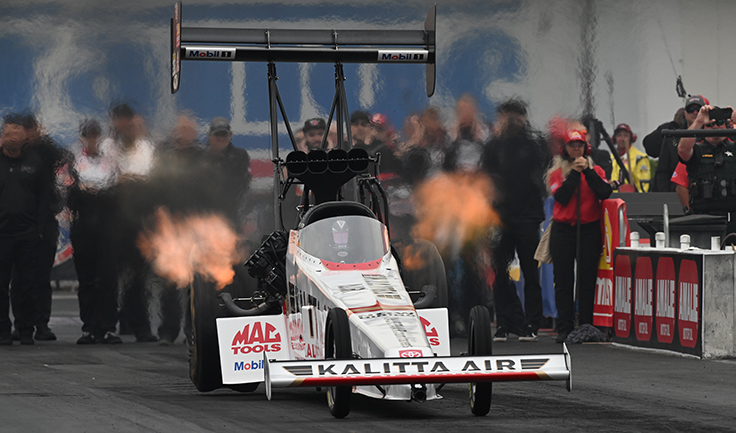 Doug Kalitta was off the line first against Steve Torrence until the pipes started spurting flames as the engine began eating itself up, allowing Torrence to recover and take the win with a 3.97.