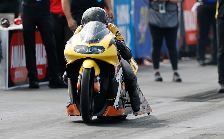The bottom half of the ladder featured all four bikes from the Matt Smith Racing camp and Matt Smith and Angie Smith advanced to the semifinals where they will engage in a husband/wife battle. Angie wheeled her Denso Buell to a 6.810 while Matt produced a 6.763 in his win against John Hall, who grabbed a big starting line advantage, but could not maintain the lead.