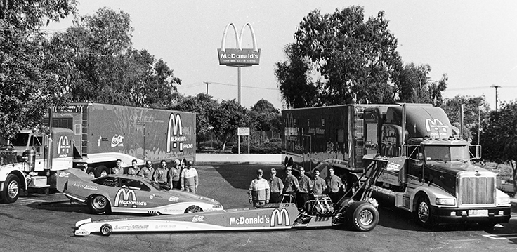 Minor’s success attracted even more corporate assistance when he landed the prestigious McDonald’s sponsorship in 1992. Said Minor, “Cruz Pedregon had joined the team earlier as the driver of our Top Fuel car. Before the 1992 season began, McCulloch asked if he could trade places with Cruz because all of his old racing buddies, including Prudhomme, Kenny Bernstein, and others, were now racing Top Fuel. We all talked it over and agreed.”