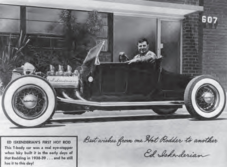 This was the card that Iskenderian would send out to admirers. Over the years, Isky sent out thousands of these photos of he and his roadster photographed in front of the Inglewood, Calif., plant. The autograph simply reads, “From one hot rodder to another.”