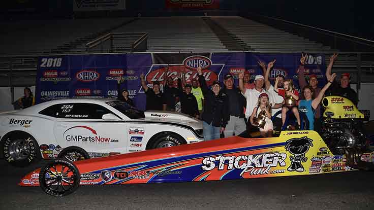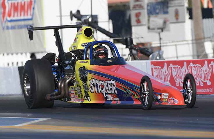 Last season, Strickland didn’t win the Gatornationals, ending his four-year run. Gainesville results aside, Strickland did have what most would consider a successful season because he was able to mount a challenge for world titles in both categories. Strickland finished second to Bubba Linke in Stock and also put together a very strong fifth-place finish in the Right Trailers Top Dragster category with his low-six-second dragster, backed by his own Sticker Punk company. Across both categories, he had four wins in five final rounds and threw in a handful of semifinals for good measure.