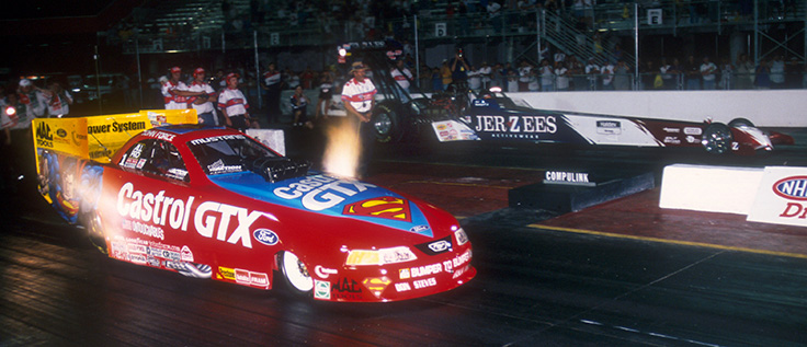 The Winston Showdown at Bristol Dragway remains a memorable "what if" moment in NHRA lore, a rare clash between the two nitro classes. The special event featured an eight-car field made up of the top four qualifiers from both the Top Fuel and Funny Car classes, racing under a unique handicap format that gave the Funny Cars a two-tenths head start. John Force, driving his Superman-themed Castrol GTX Ford Mustang, advanced to the final, where he defeated Top Fuel’s Bob Vandergriff Jr. by just .011-second.