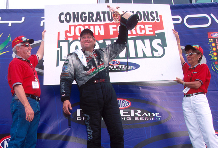John Force made history on April 14, 2002, at the NHRA SpringNationals when he became the first NHRA driver to record 100 national event victories. Force defeated Tommy Johnson Jr. in the Funny Car final at Houston Raceway Park and would go on to win 57 more times before his retirement in late 2025.