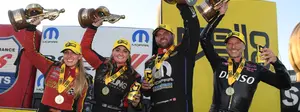 In lieu of a traditional Awards Ceremony that was not possible this year, NHRA provided the 2020 Camping World NHRA world champion teams with celebratory champagne, championship masks, t-shirts, and all of the makings for a lockerroom-style celebration.