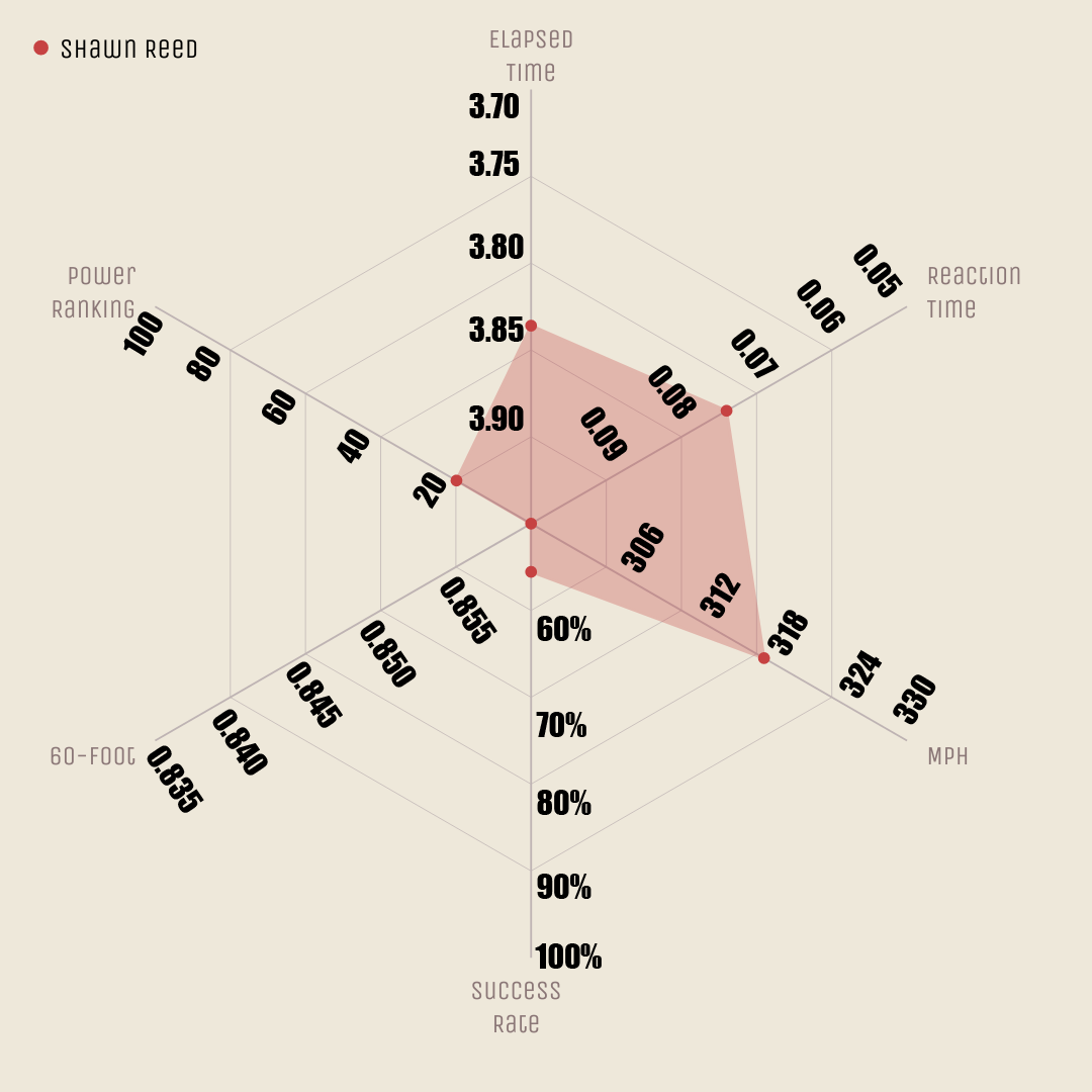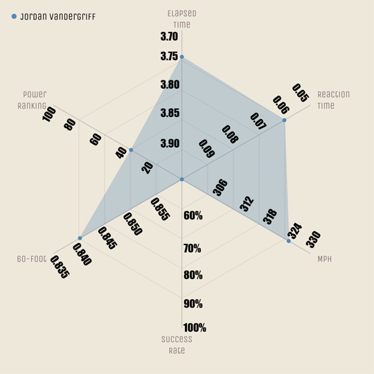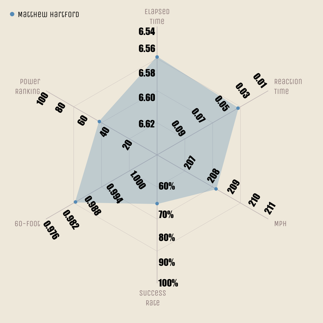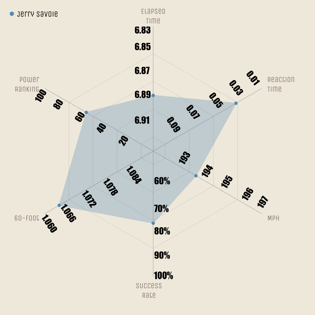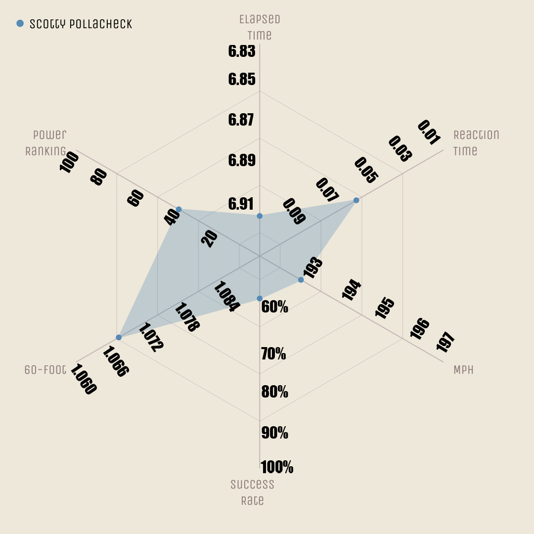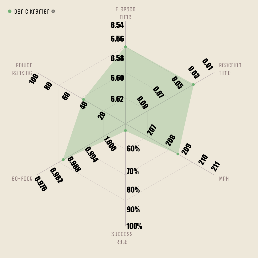 It's possible to have no visible data because the center isn't zero -- it's a few rungs below average. In the interest of including as many racers as possible, but also showing a wide spread of variation, a balance had to be struck in that way. So you'll see Vandergriff doesn't have a bar for "success rate" (how often he gets down the track) -- it's not zero percent, but it's below the lowest shown number (50 percent).