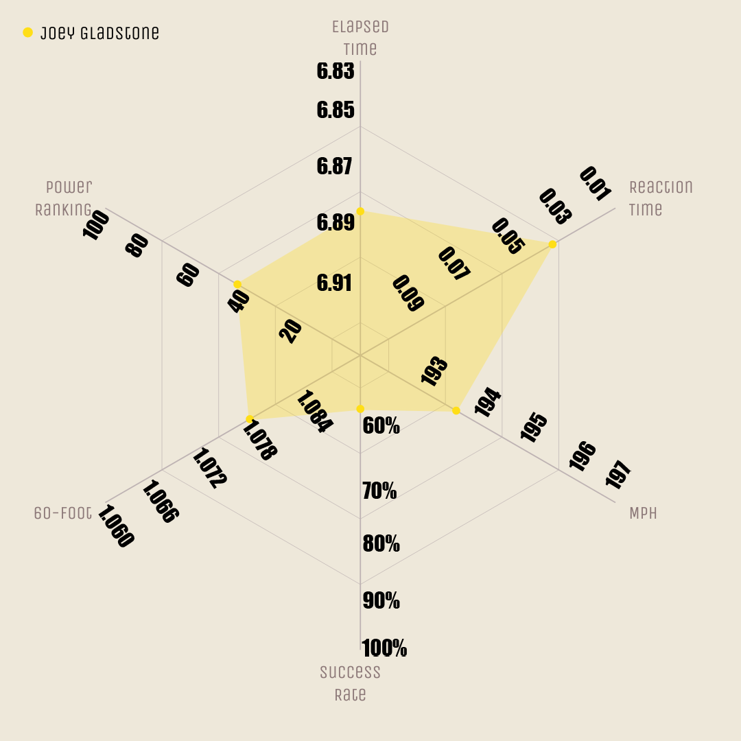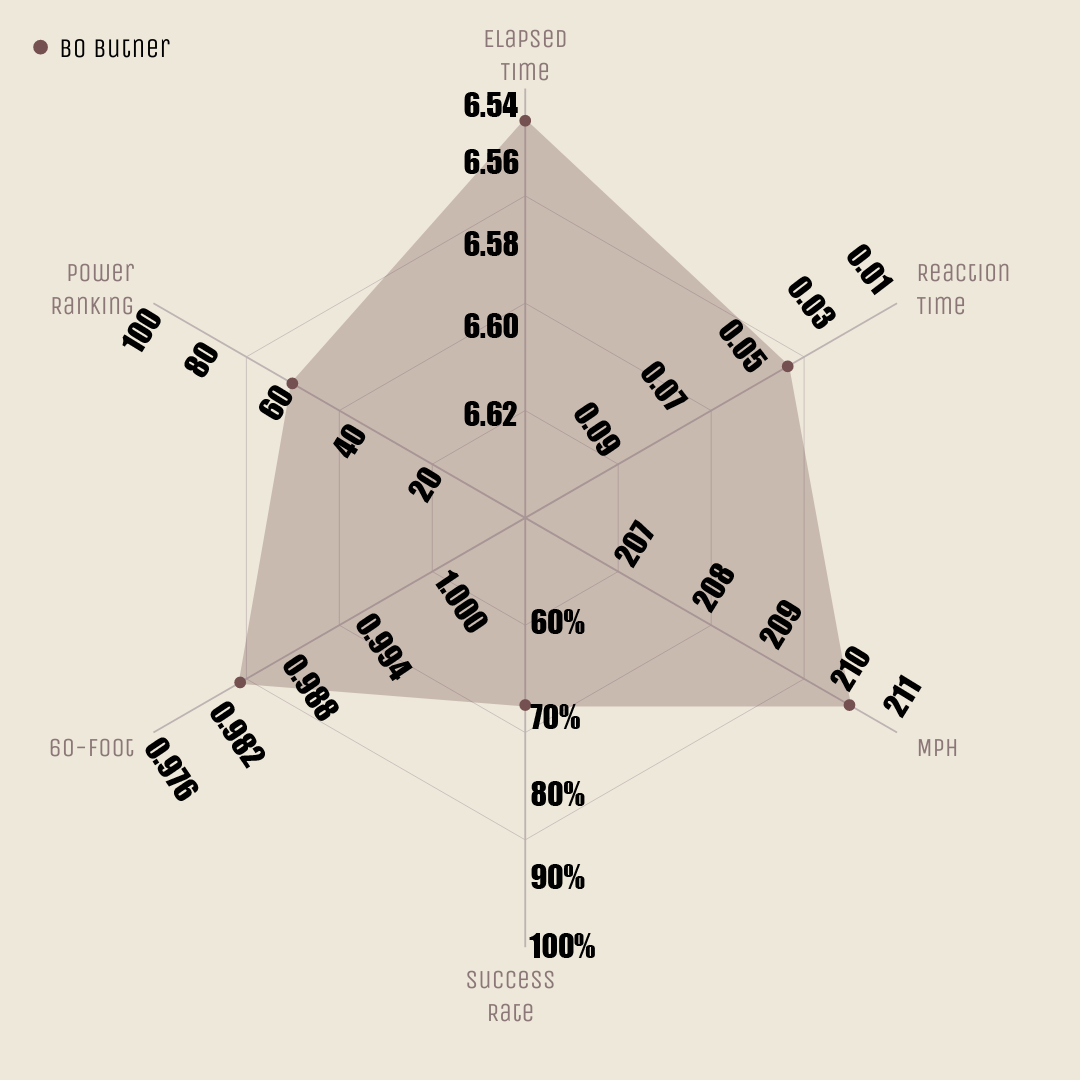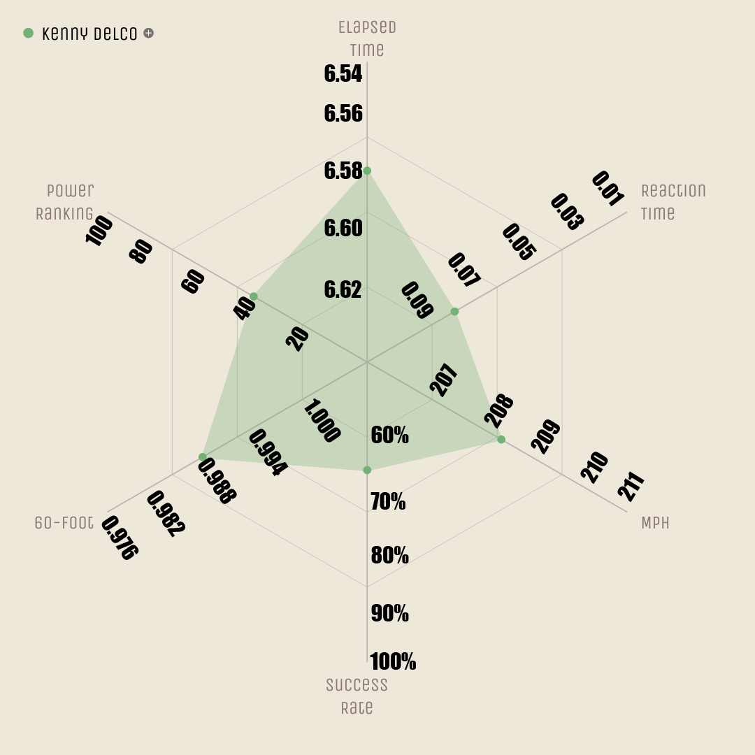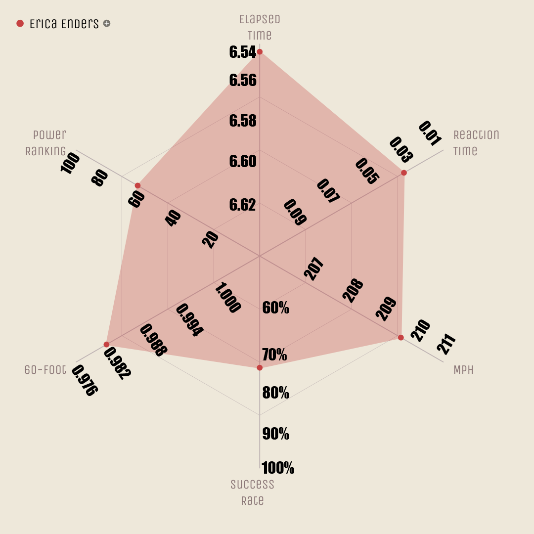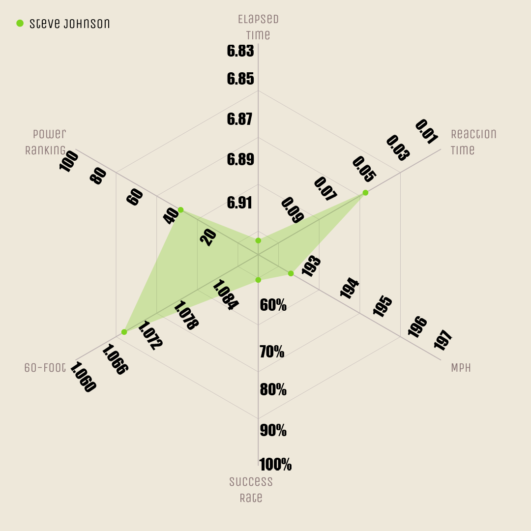It's possible to have no visible data because the center isn't zero -- it's a few rungs below average. In the interest of including as many racers as possible, but also showing a wide spread of variation, a balance had to be struck in that way. So you'll see Vandergriff doesn't have a bar for "success rate" (how often he gets down the track) -- it's not zero percent, but it's below the lowest shown number (50 percent).