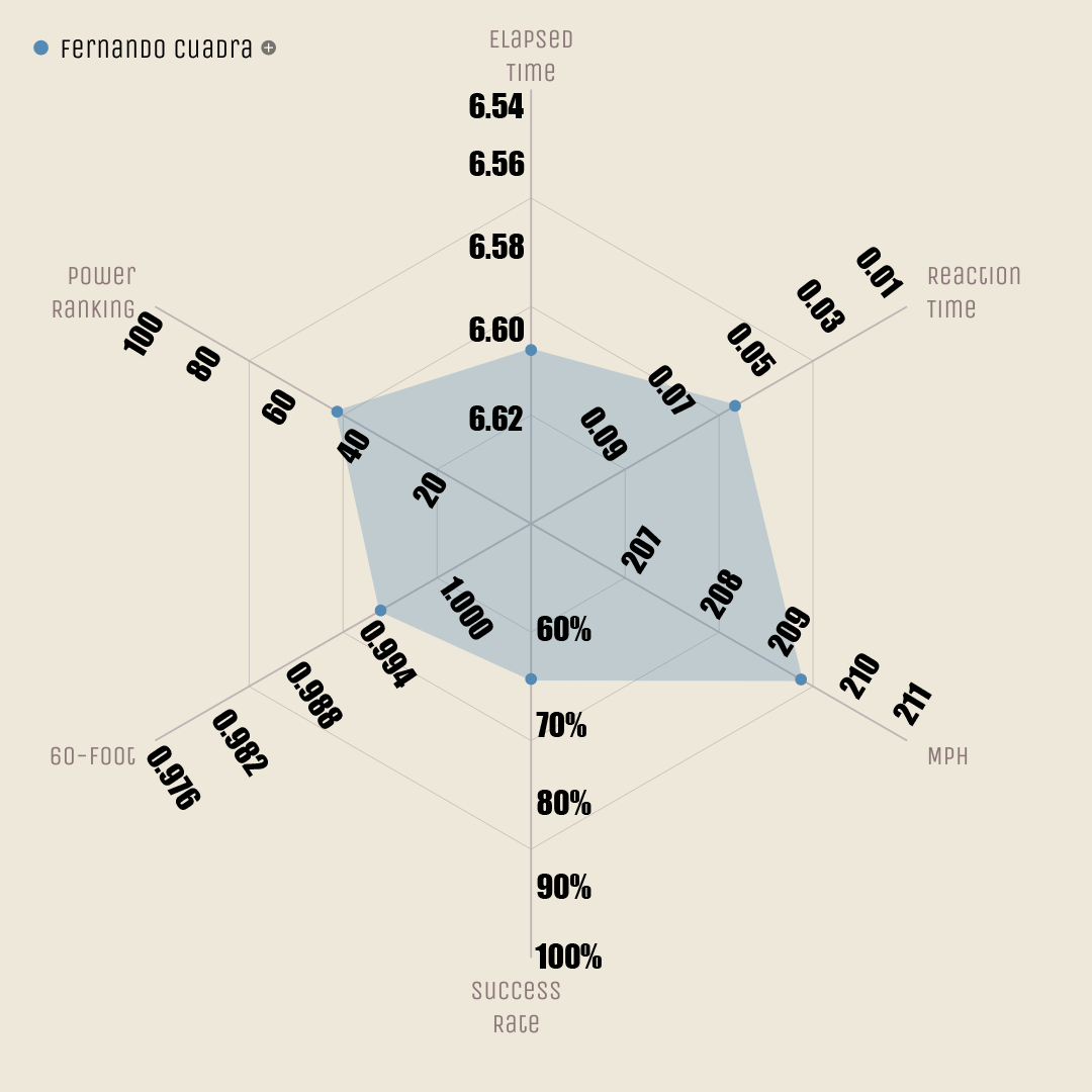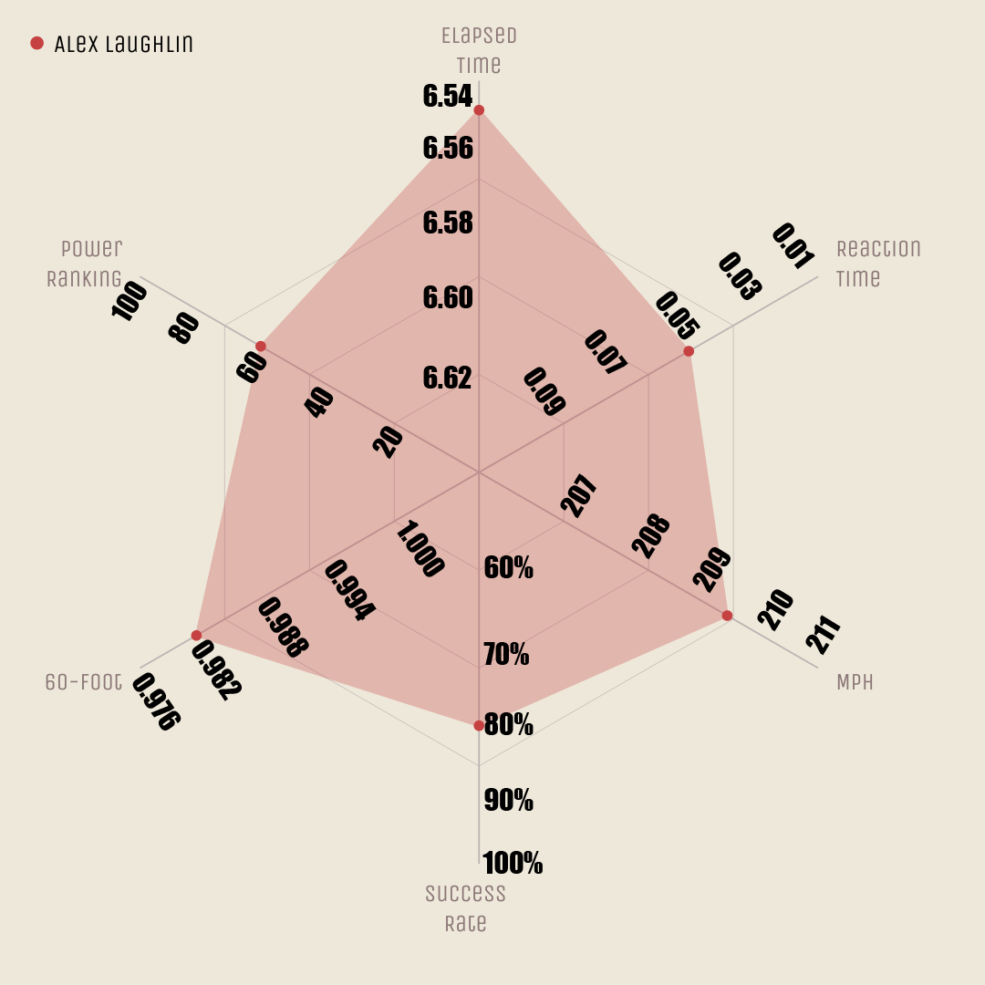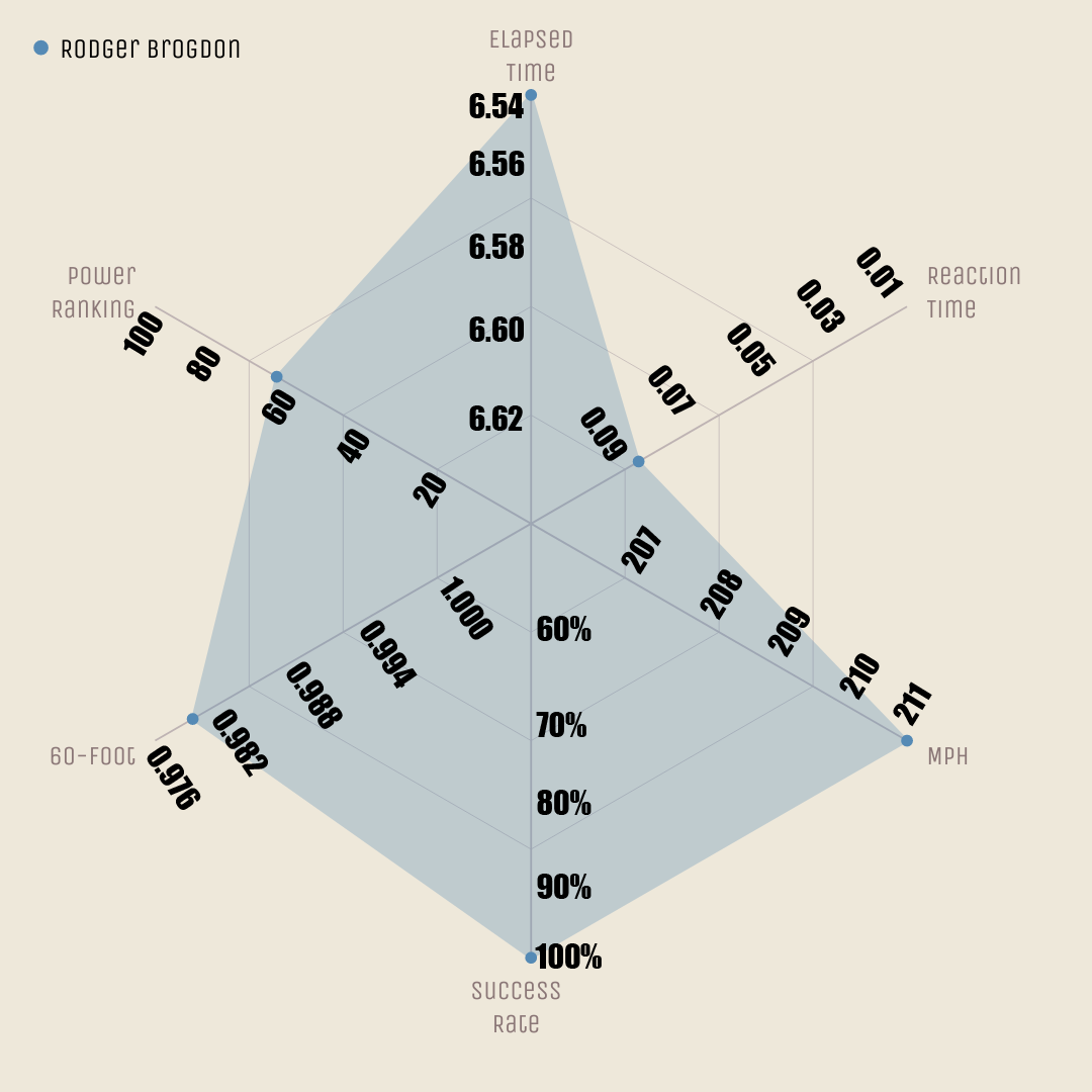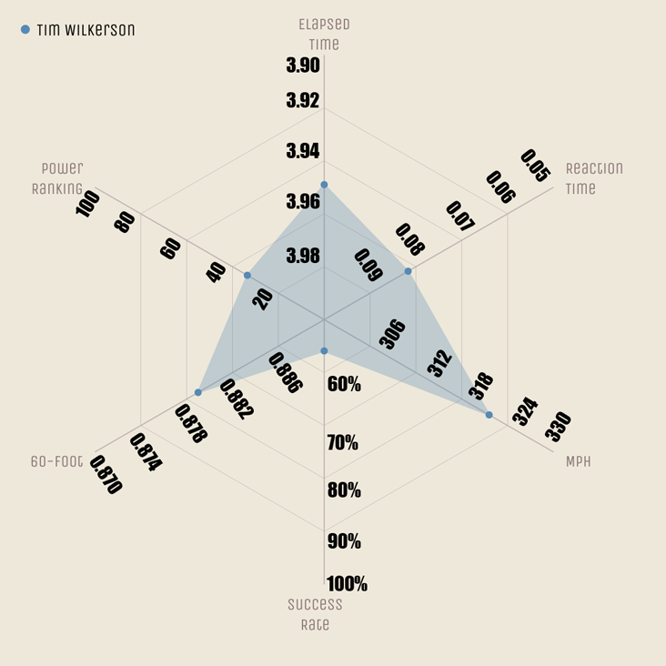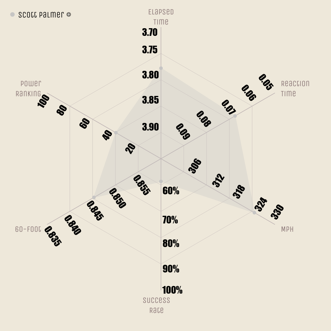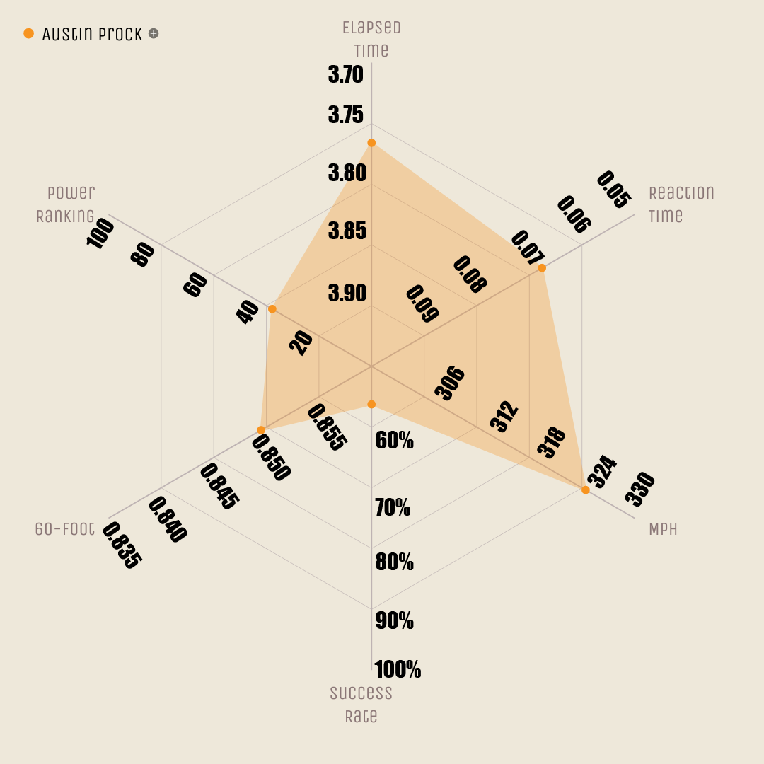 It's possible to have no visible data because the center isn't zero -- it's a few rungs below average. In the interest of including as many racers as possible, but also showing a wide spread of variation, a balance had to be struck in that way. So you'll see Vandergriff doesn't have a bar for "success rate" (how often he gets down the track) -- it's not zero percent, but it's below the lowest shown number (50 percent).