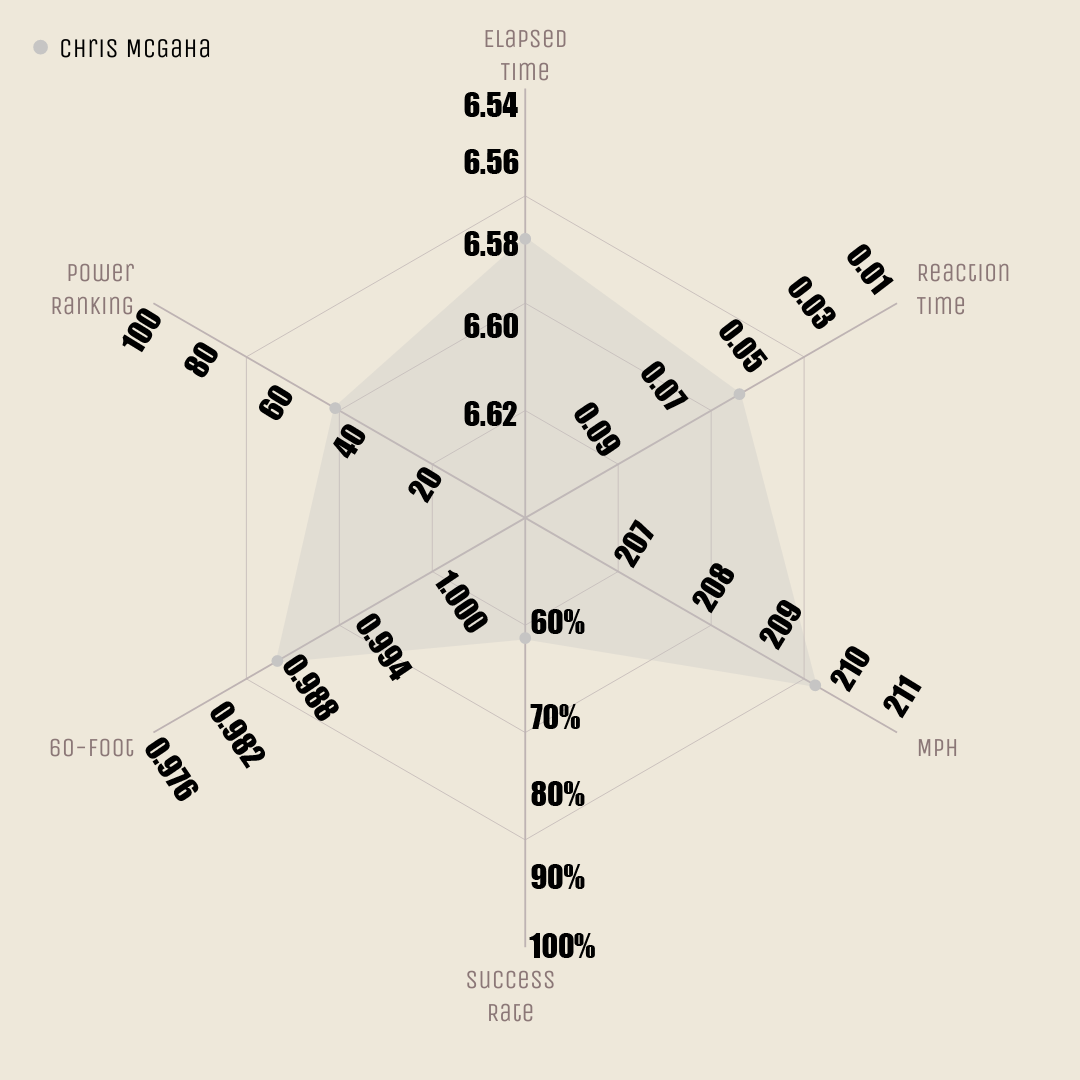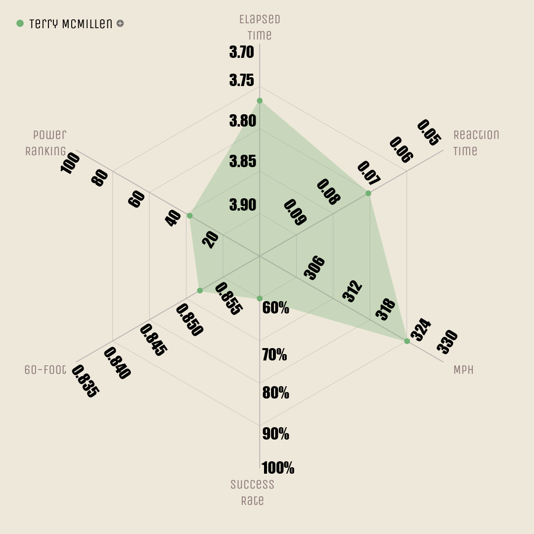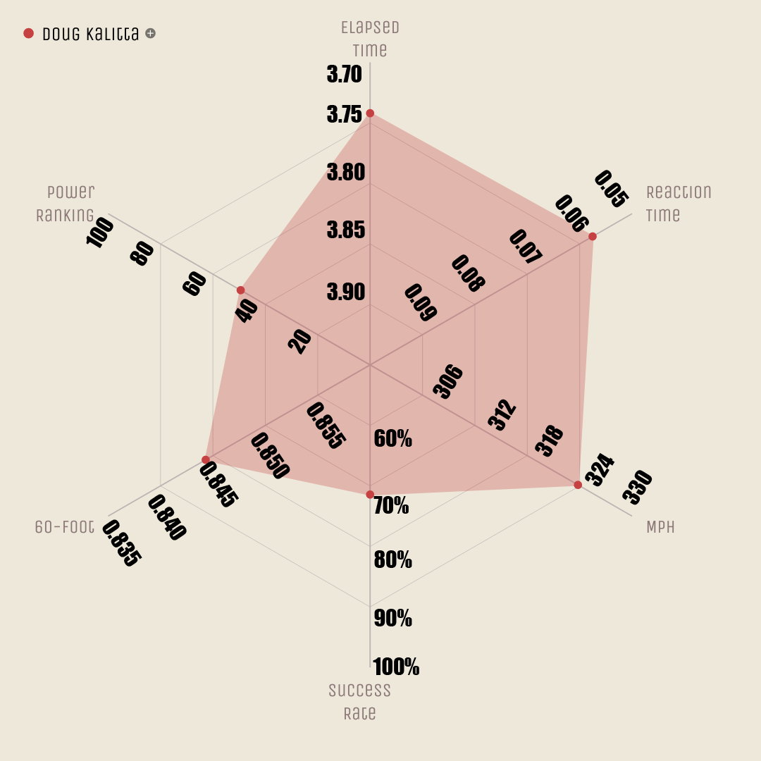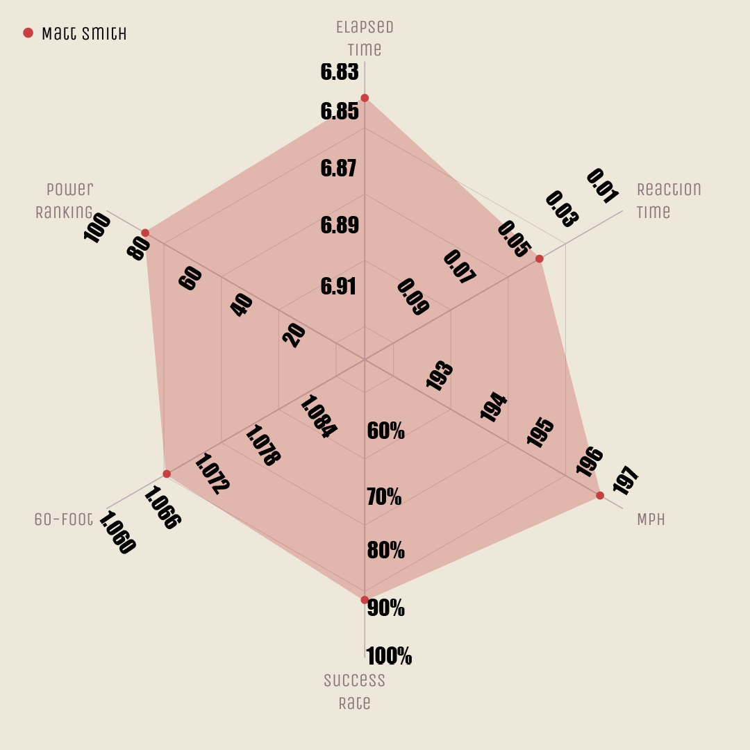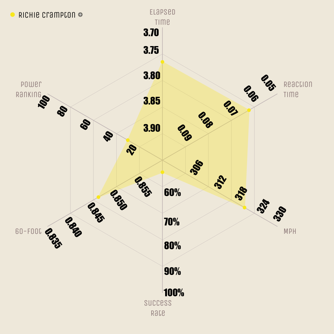 It's possible to have no visible data because the center isn't zero -- it's a few rungs below average. In the interest of including as many racers as possible, but also showing a wide spread of variation, a balance had to be struck in that way. So you'll see Vandergriff doesn't have a bar for "success rate" (how often he gets down the track) -- it's not zero percent, but it's below the lowest shown number (50 percent).
