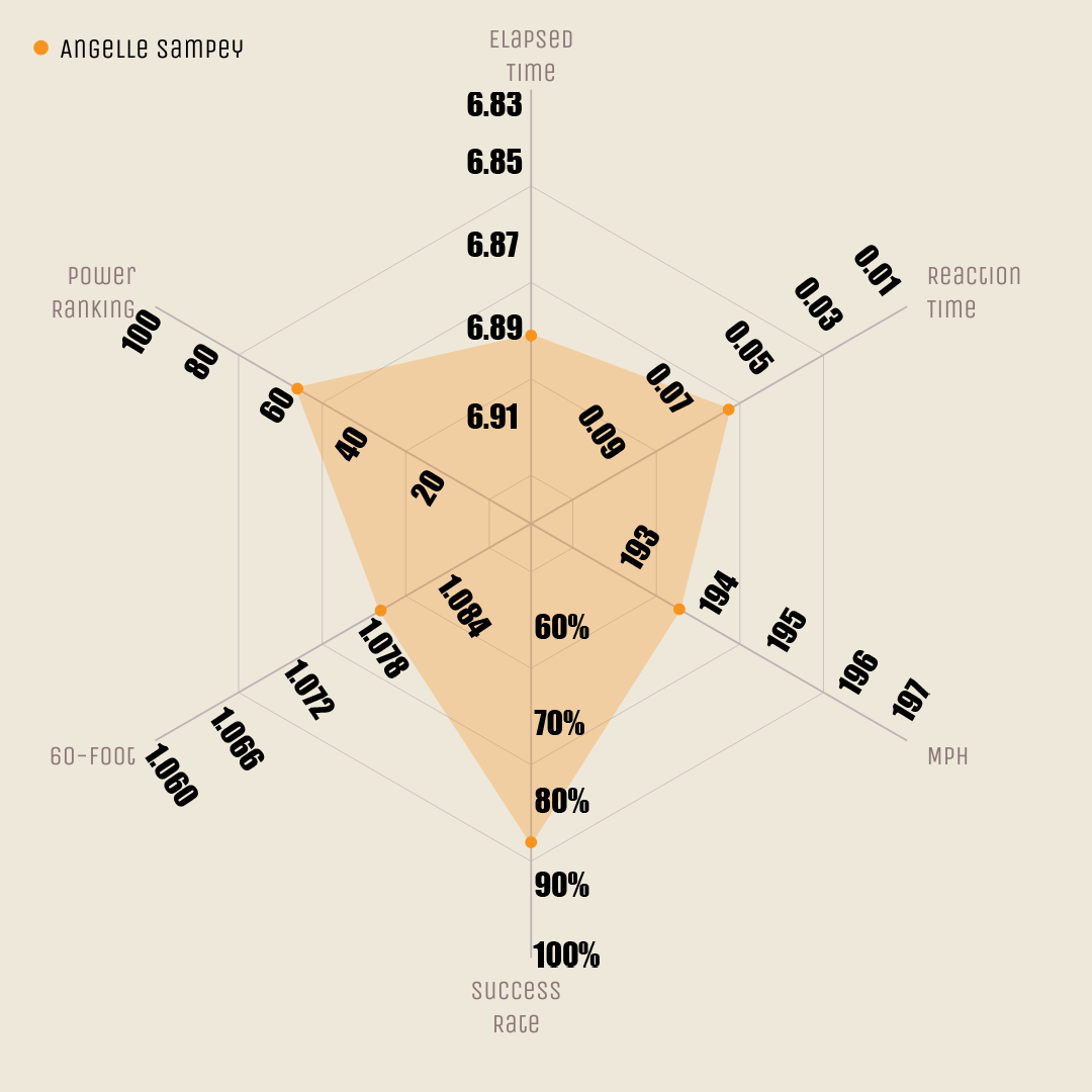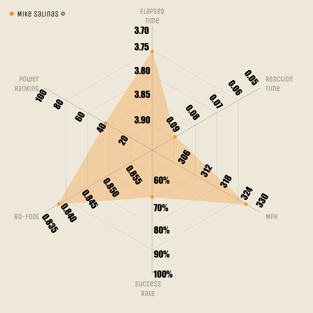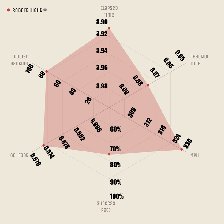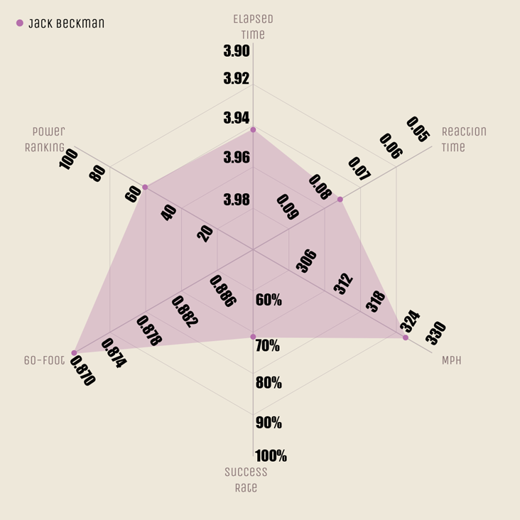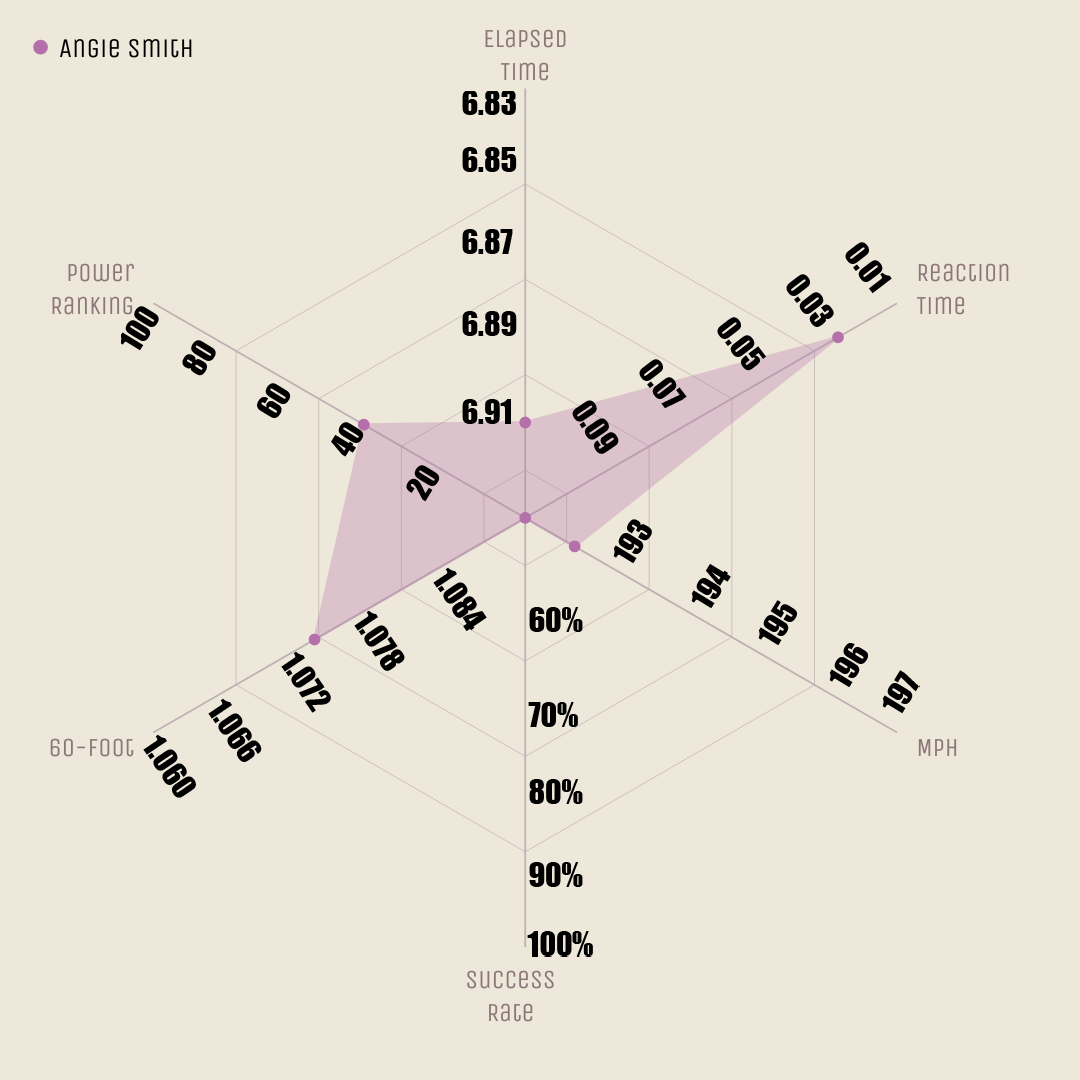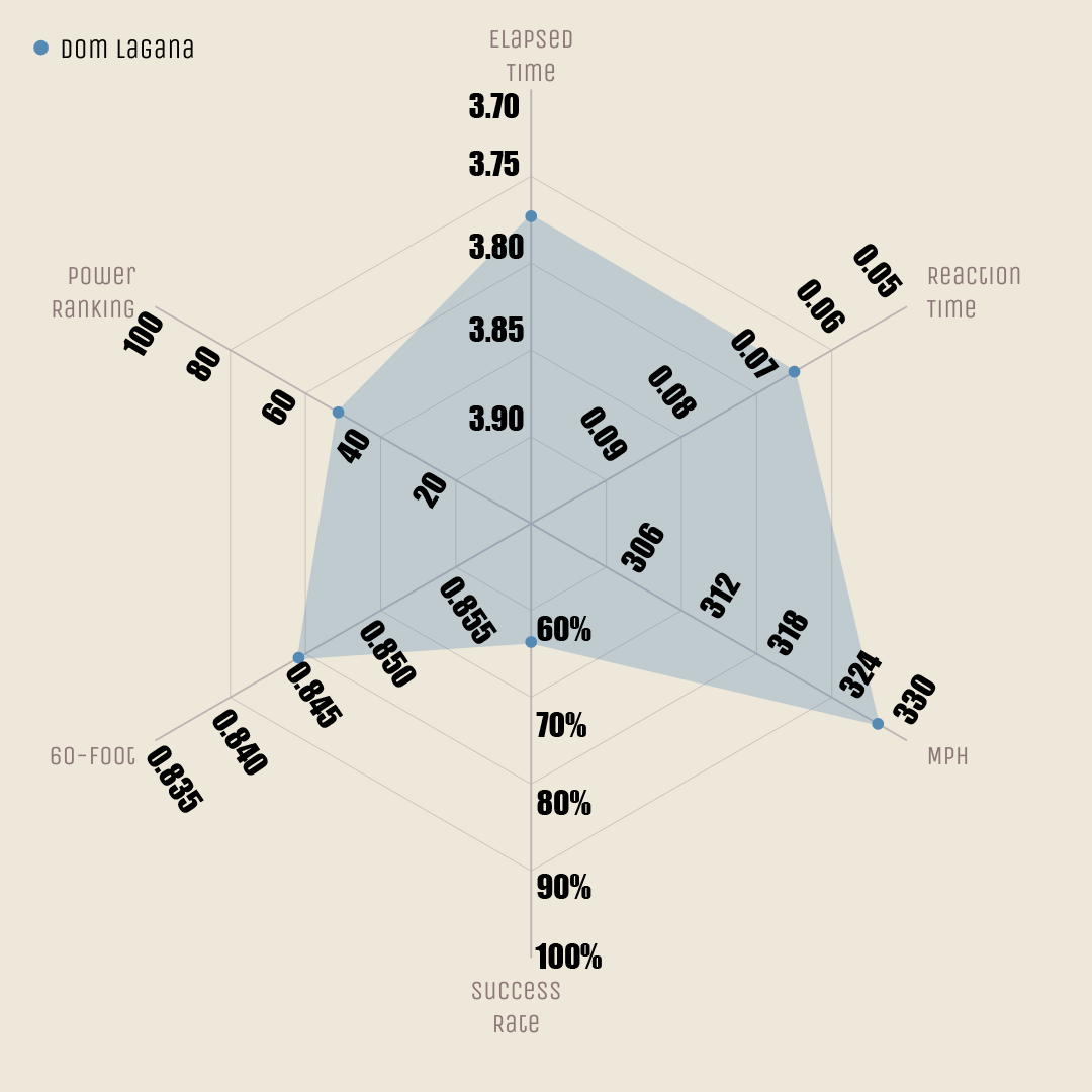 It's possible to have no visible data because the center isn't zero -- it's a few rungs below average. In the interest of including as many racers as possible, but also showing a wide spread of variation, a balance had to be struck in that way. So you'll see Vandergriff doesn't have a bar for "success rate" (how often he gets down the track) -- it's not zero percent, but it's below the lowest shown number (50 percent).