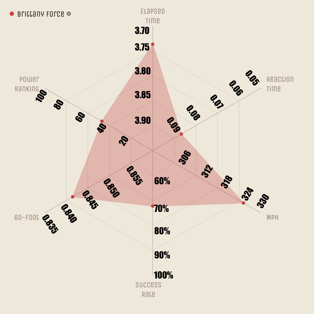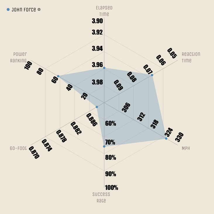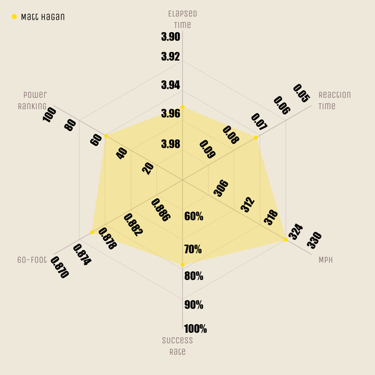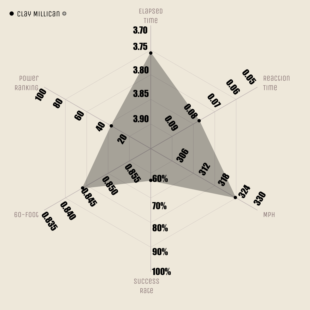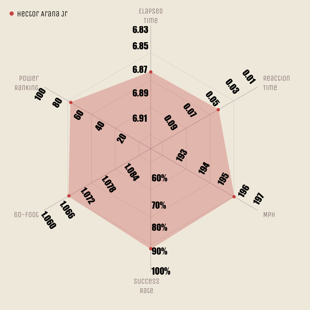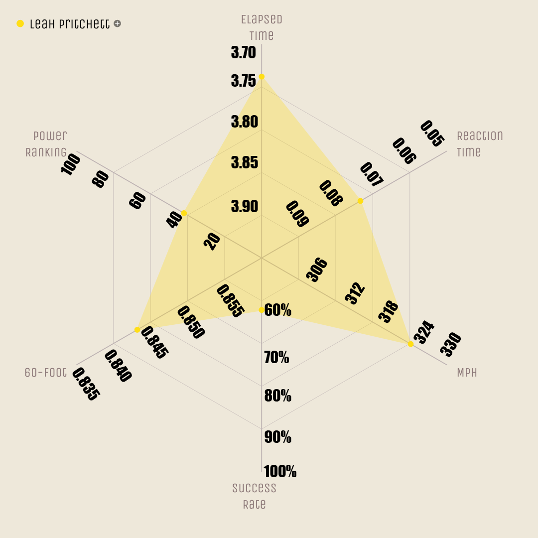 It's possible to have no visible data because the center isn't zero -- it's a few rungs below average. In the interest of including as many racers as possible, but also showing a wide spread of variation, a balance had to be struck in that way. So you'll see Vandergriff doesn't have a bar for "success rate" (how often he gets down the track) -- it's not zero percent, but it's below the lowest shown number (50 percent).