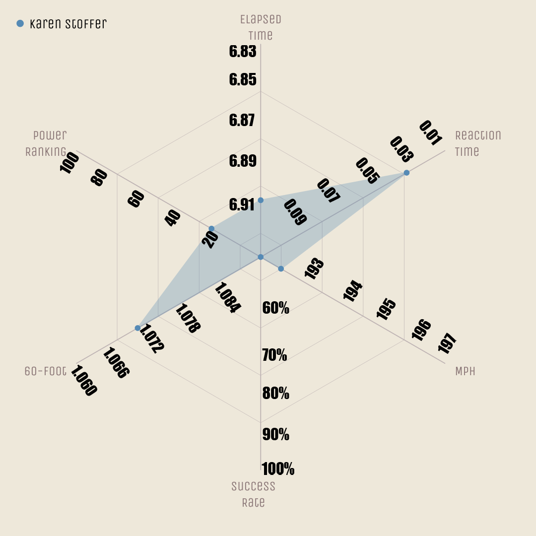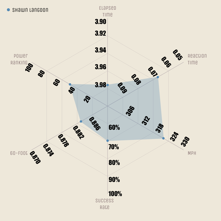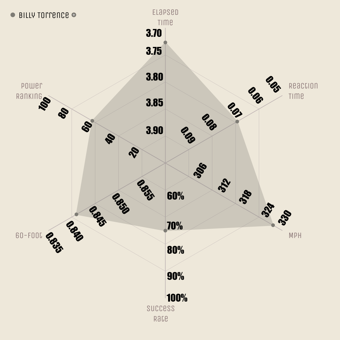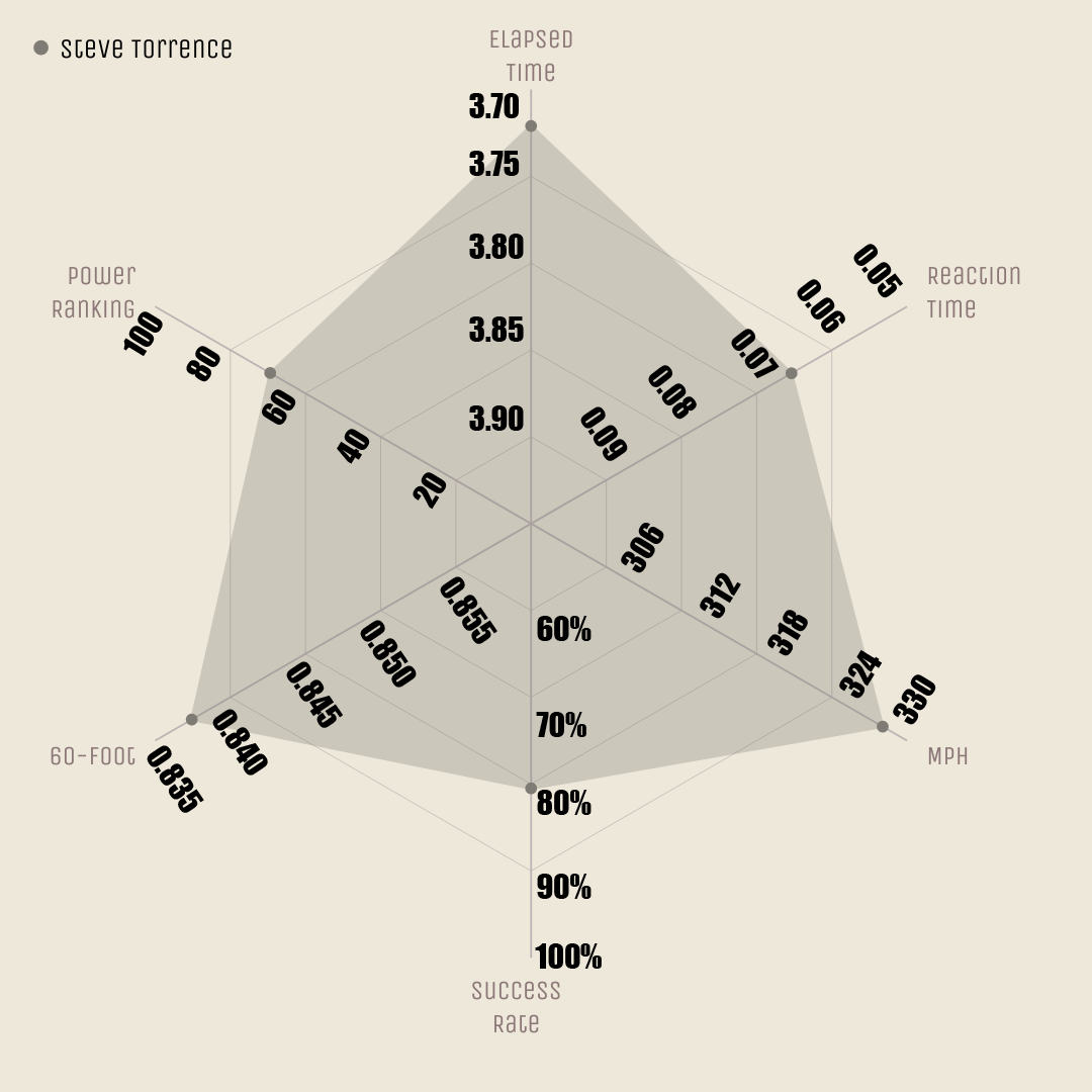 Radar charts show several statistics at the same time on one image. The below image shows Steve Torrence [really good] compared to Jordan Vandergriff [also good! Just not as good!] to give an idea of how you can compare to charts to get a quick glimpse of how two race teams compare heading into Sunday eliminations. Bigger is always better on these charts -- so the further the racer gets from the center, the better off the racer is.